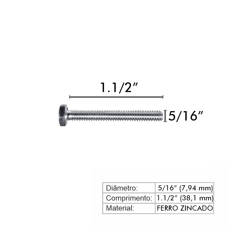 O Parafuso sextavado zincado 5/16 x 1.1/2” é ideal para uso em ambientes propensos a corrosão, devido ao seu acabamento em zinco polido que assegura segurança e durabilidade.