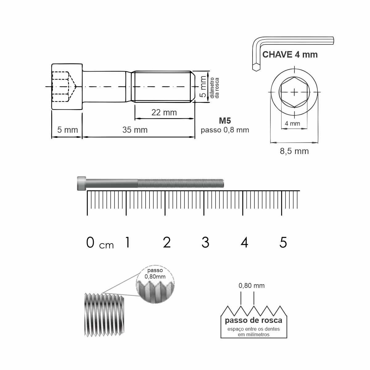Diâmetro Nominal da Rosca: M5 (rosca métrica ISO, diâmetro externo de 5 mm).