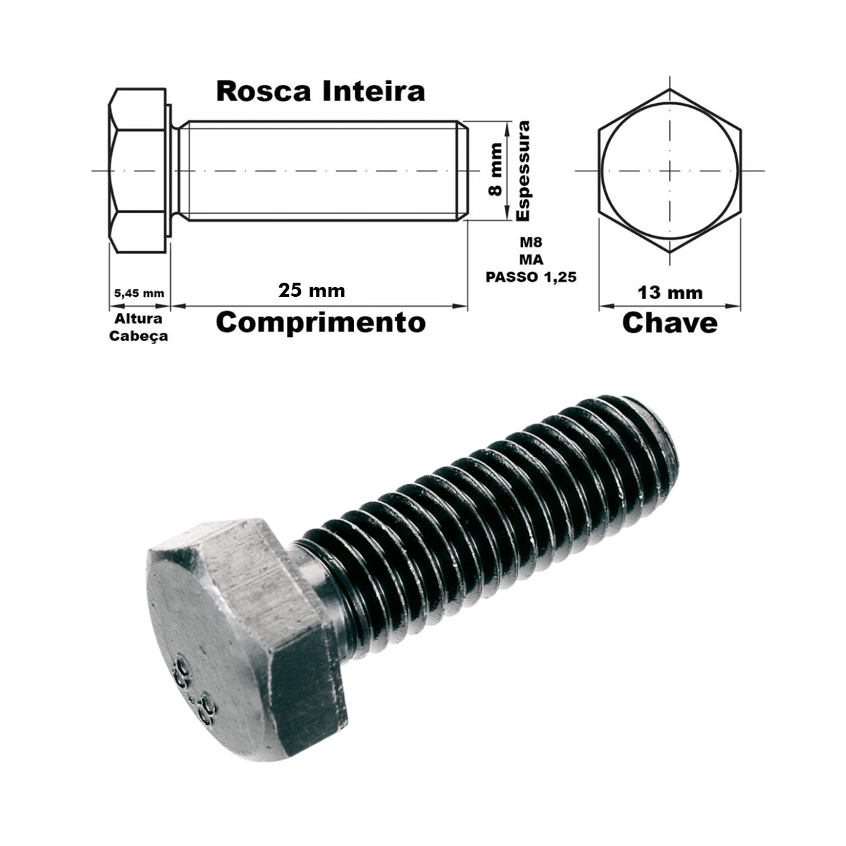 - Rosca: Métrica (M8), com passo de 1.25mm - MA.