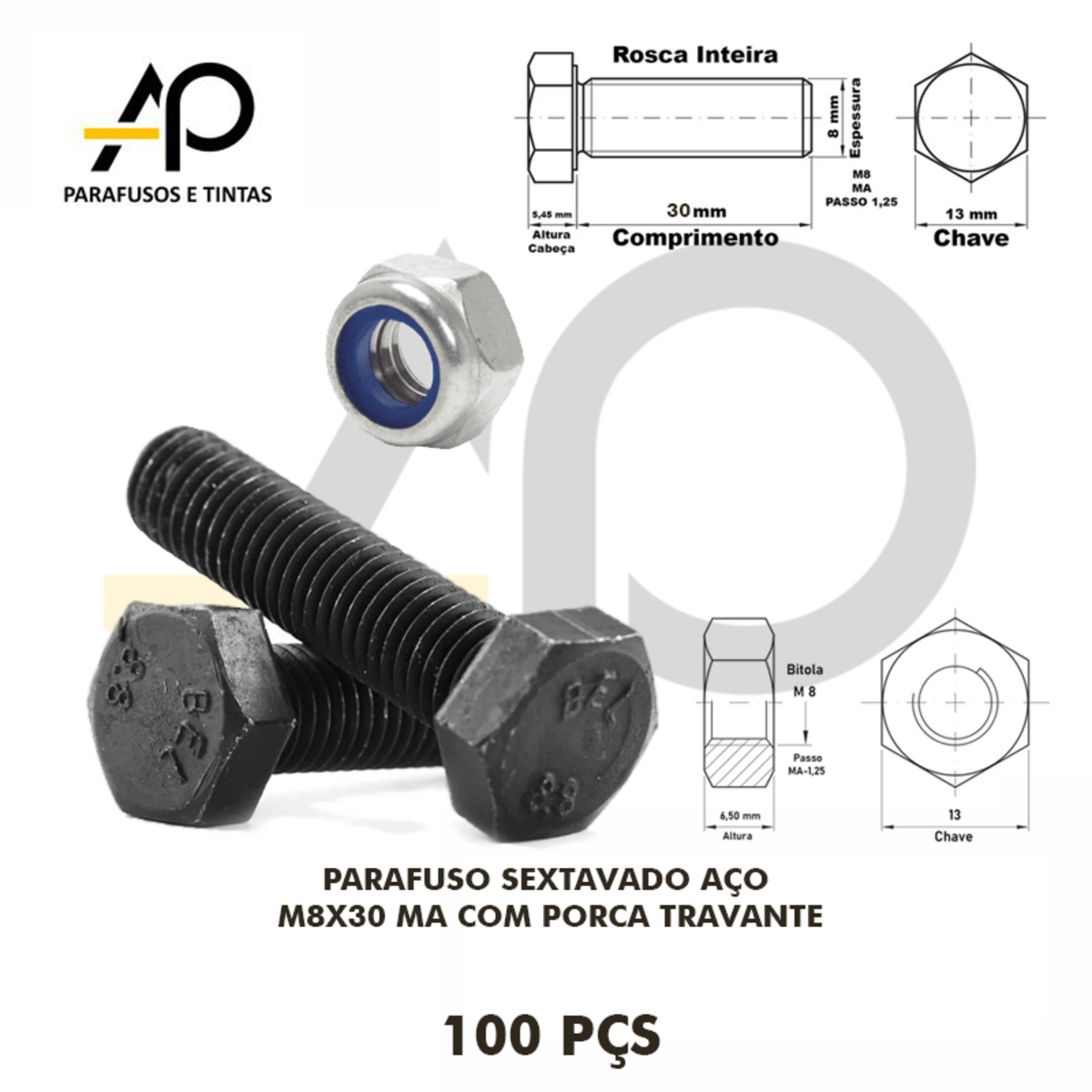 PARAFUSO SEXTAVADO AÇO M8X30 MA COM PORCA TRAVANTE - 100 UNID.Cód. 159180