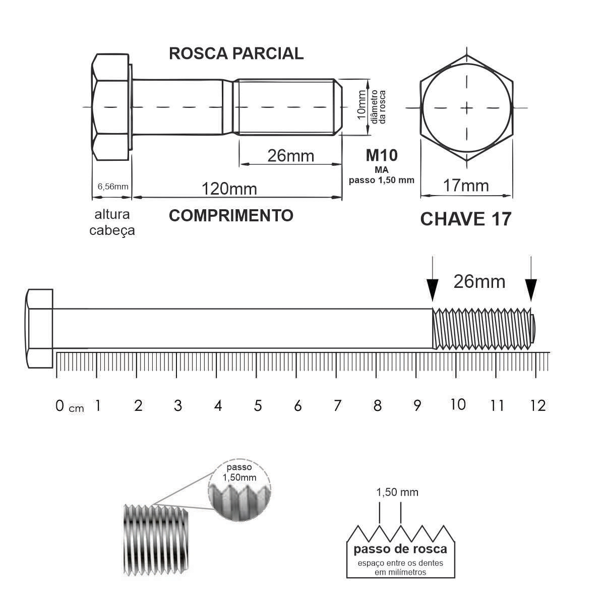 Parafuso com cabeça sextavada, rosca métrica M10, fabricado em aço carbono classe 8.8, ideal para aplicações que exigem alta resistência mecânica e excelente desempenho estrutural.