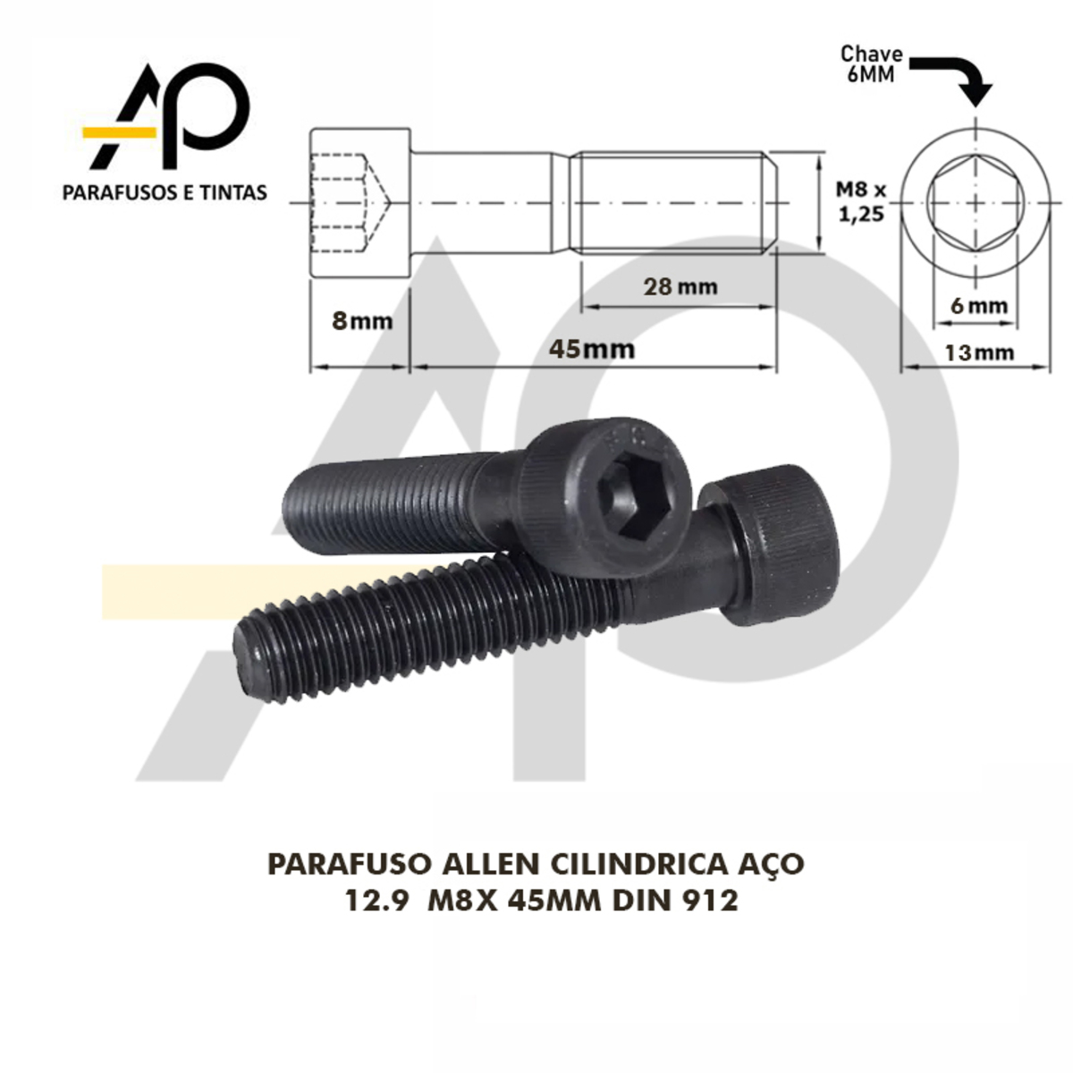 PARAFUSO ALLEN CILINDRICA AÇO 12.9 M8 X 45MM DIN 912 - 20 PEÇAS