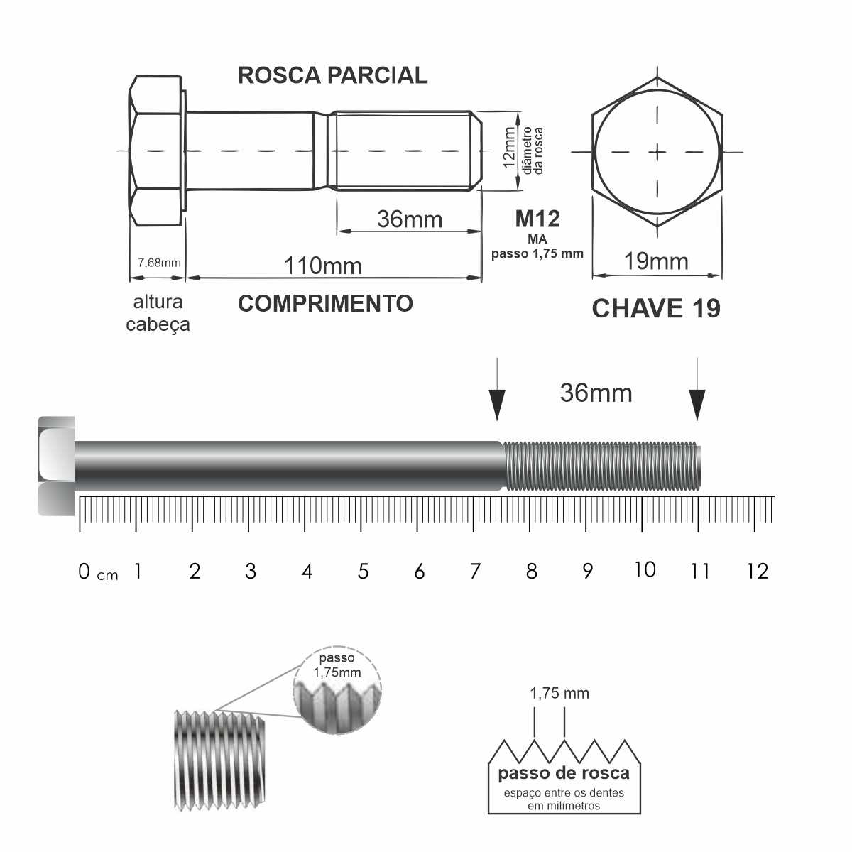 Diâmetro da Rosca: M12 (rosca métrica de 12 mm)
