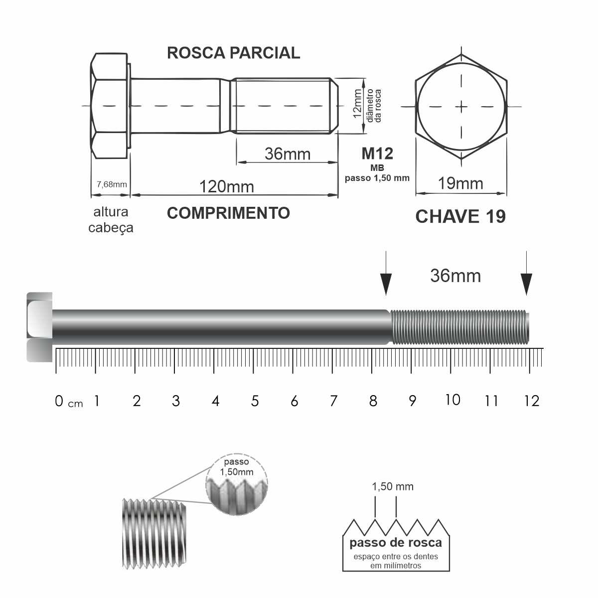 Parafuso Sextavado Aço 8.8 M12 – Tipo de Rosca: MB passo 1,50mm