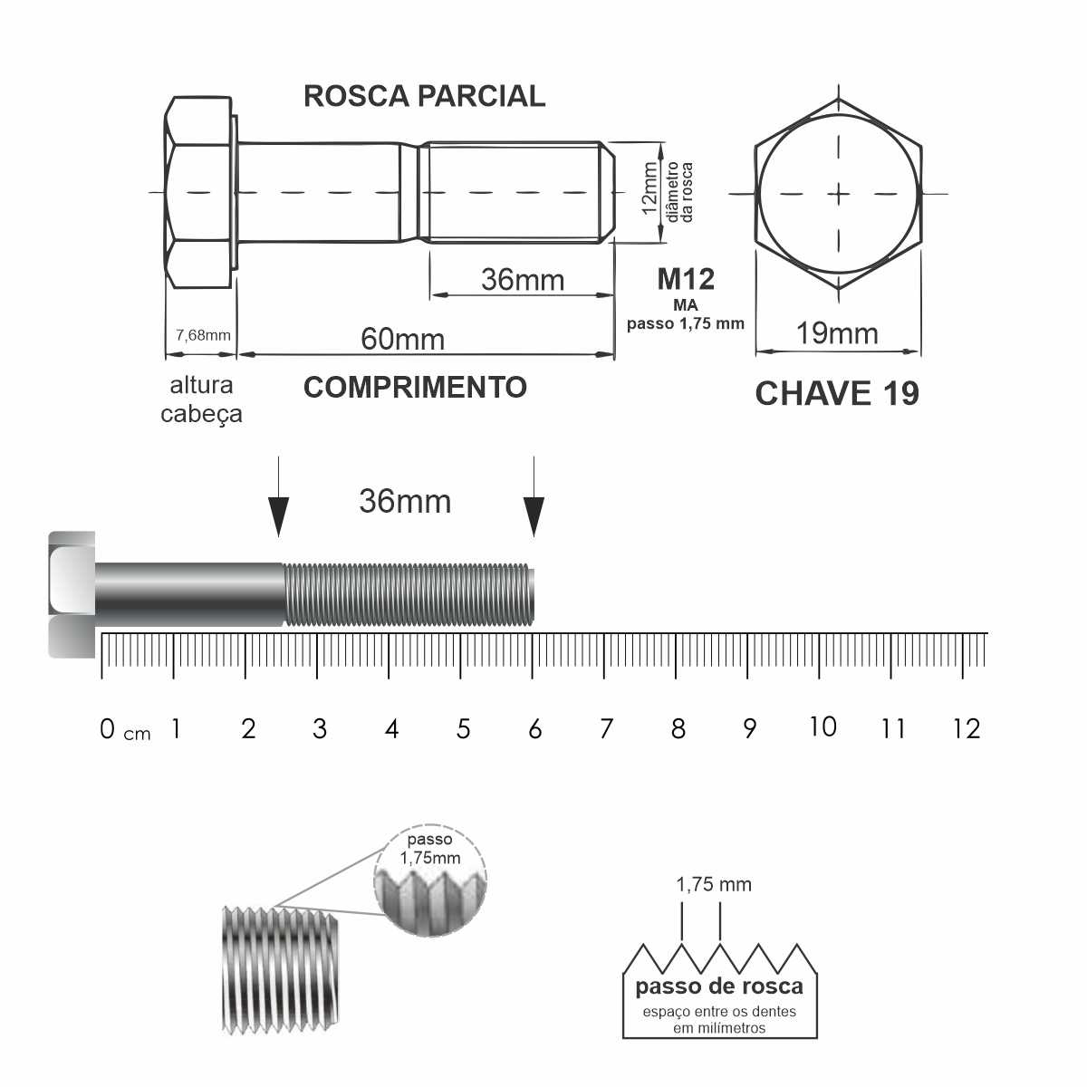 Parafuso Sextavado Aço 8.8 M12 – Tipo de Rosca: MA passo 1,75mm