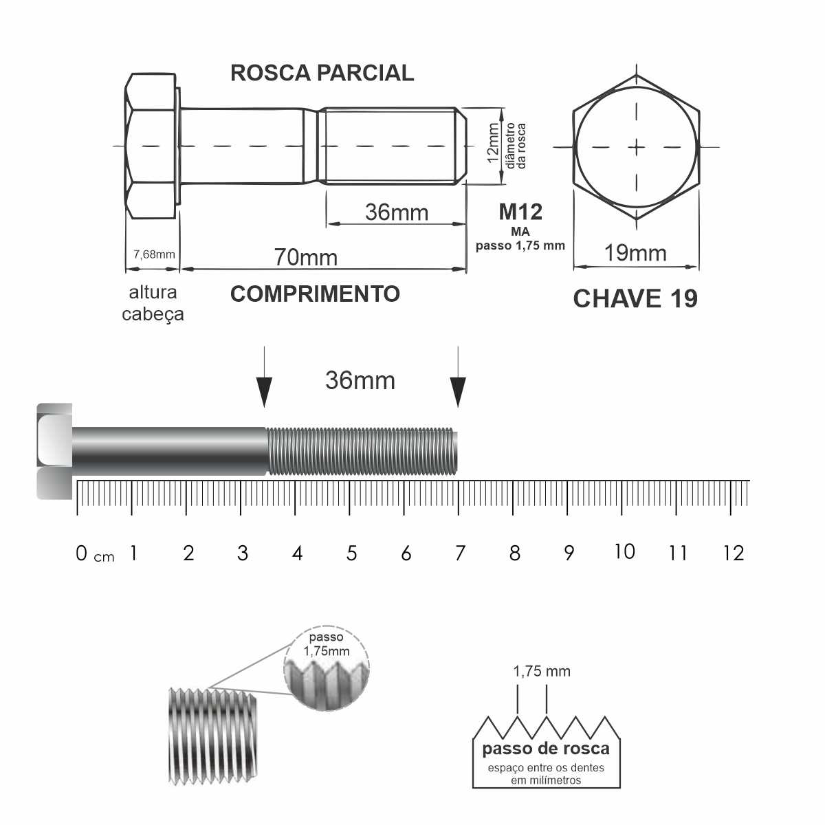 Parafuso Sextavado Aço 8.8 M12 – Tipo de Rosca: MA passo 1,75mm