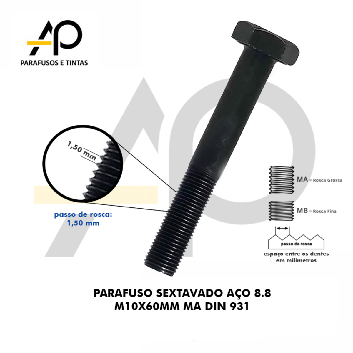 PARAFUSO SEXTAVADO AÇO 8.8 M10X60MM MA DIN 931-5 PEÇASCód. 161381