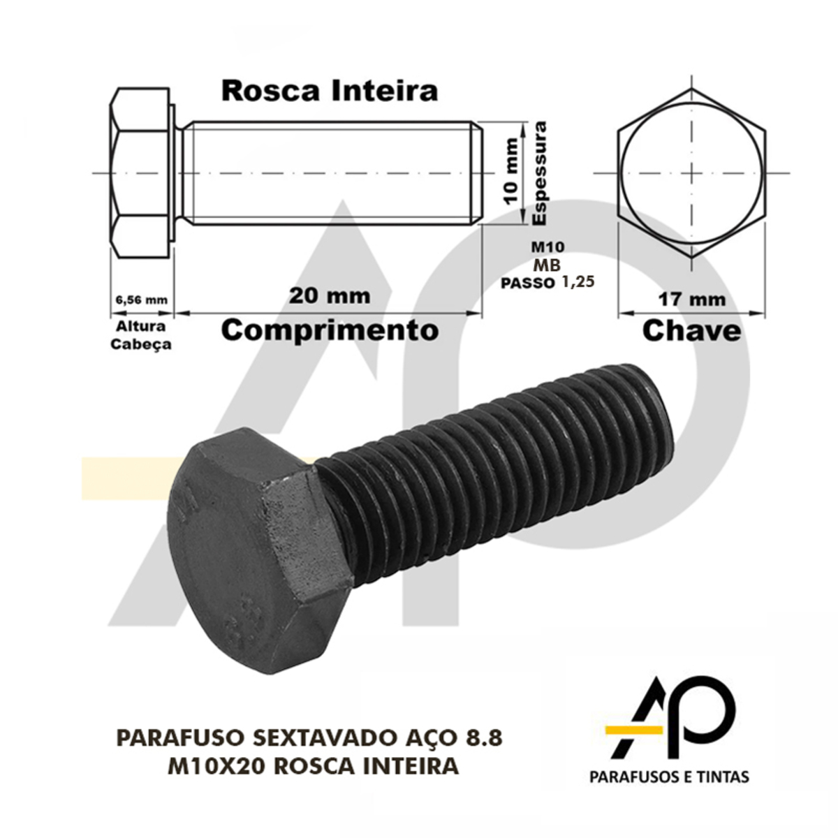 PARAFUSO SEXTAVADO AÇO 8.8 M10X20 ROSCA INTEIRA PASSO 1,25-50 UNID.