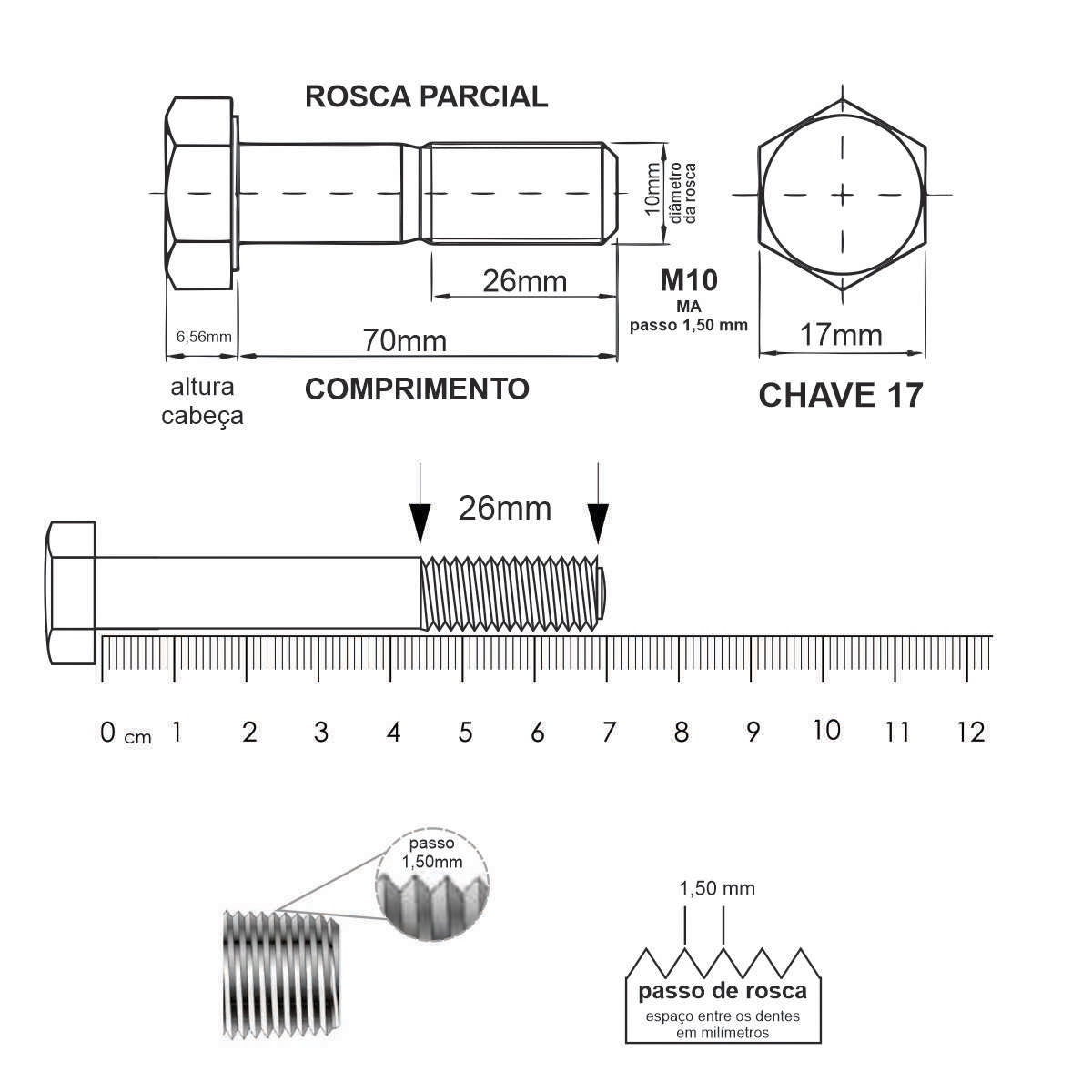 - Rosca: Métrica ISO (padrão DIN 933 / DIN 931)