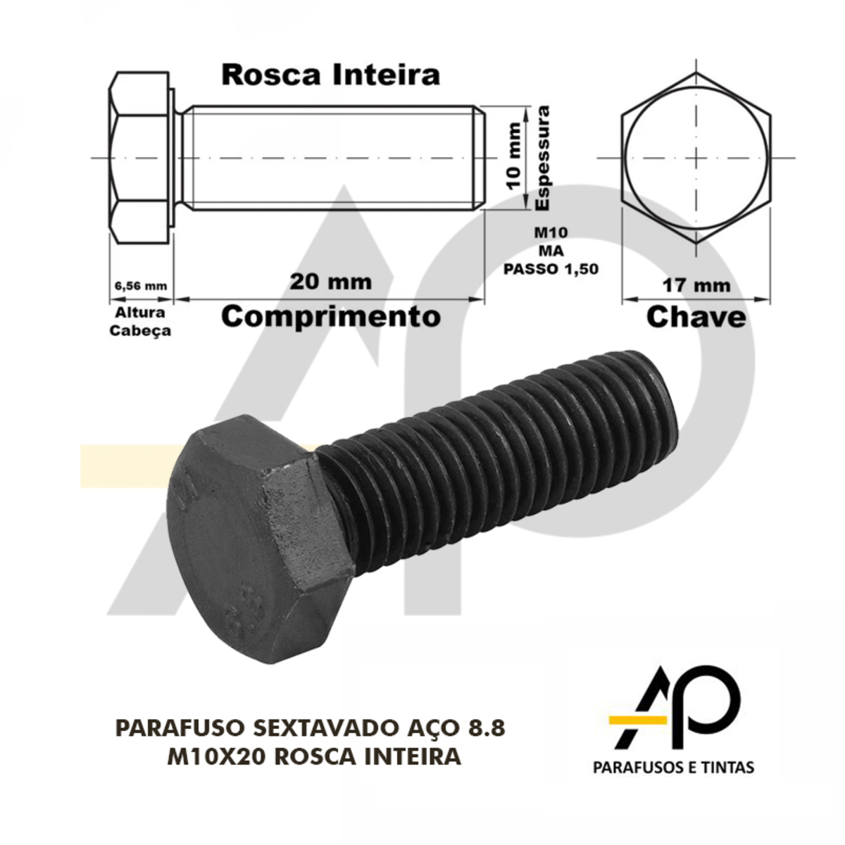 PARAFUSO SEXTAVADO AÇO 8.8 M10X20MM ROSCA INTEIRA PASSO 1,5-50 UNID.Cód. 164221
