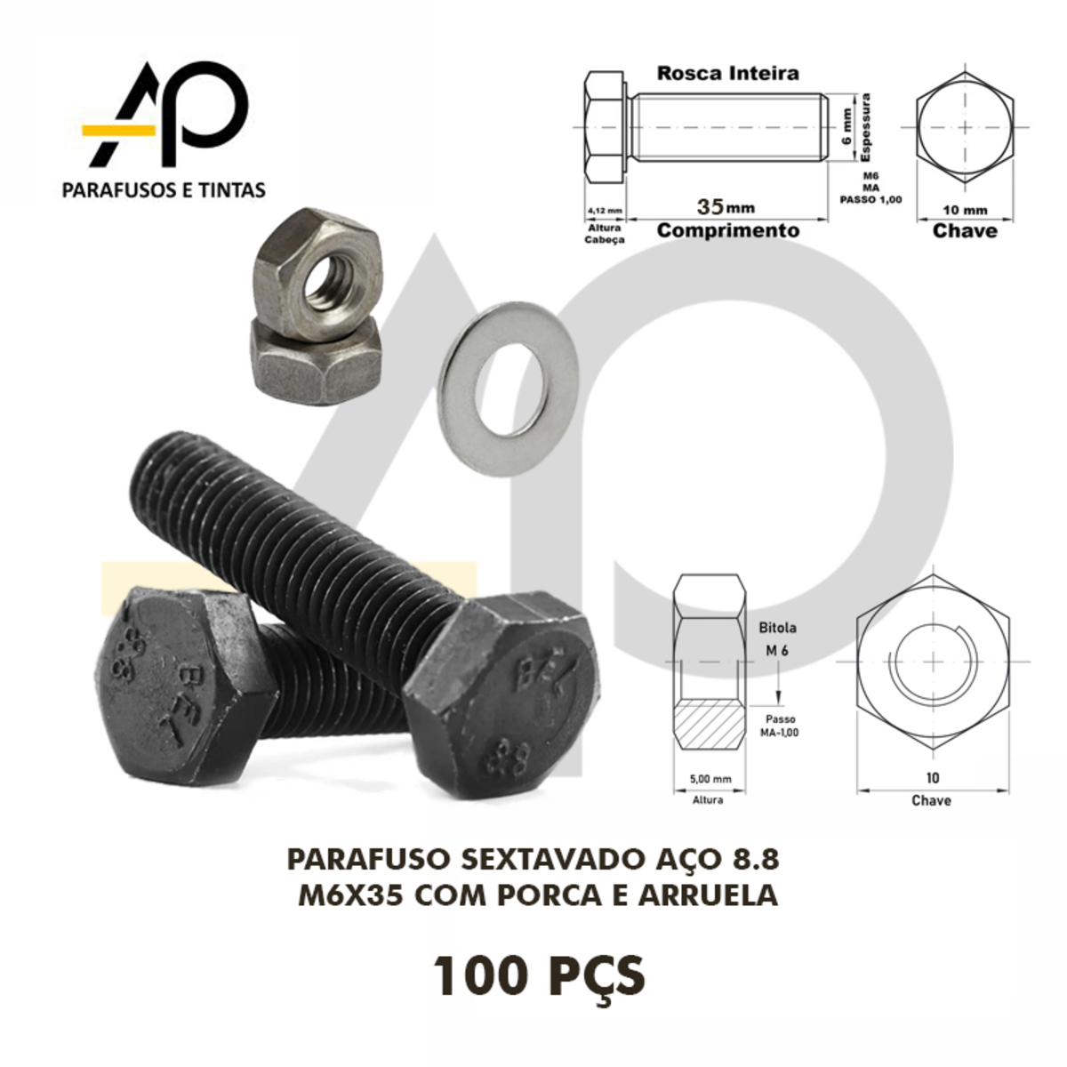 PARAFUSO SEXTAVADO AÇO 8.8 M6X35 COM PORCA E ARRUELA - 100 UNID.Cód. 159135