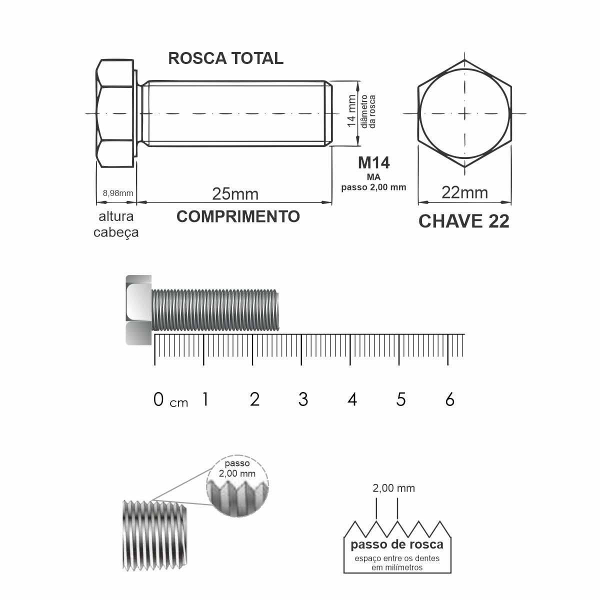 - Rosca: Métrica ISO (padrão DIN 933 / DIN 931)