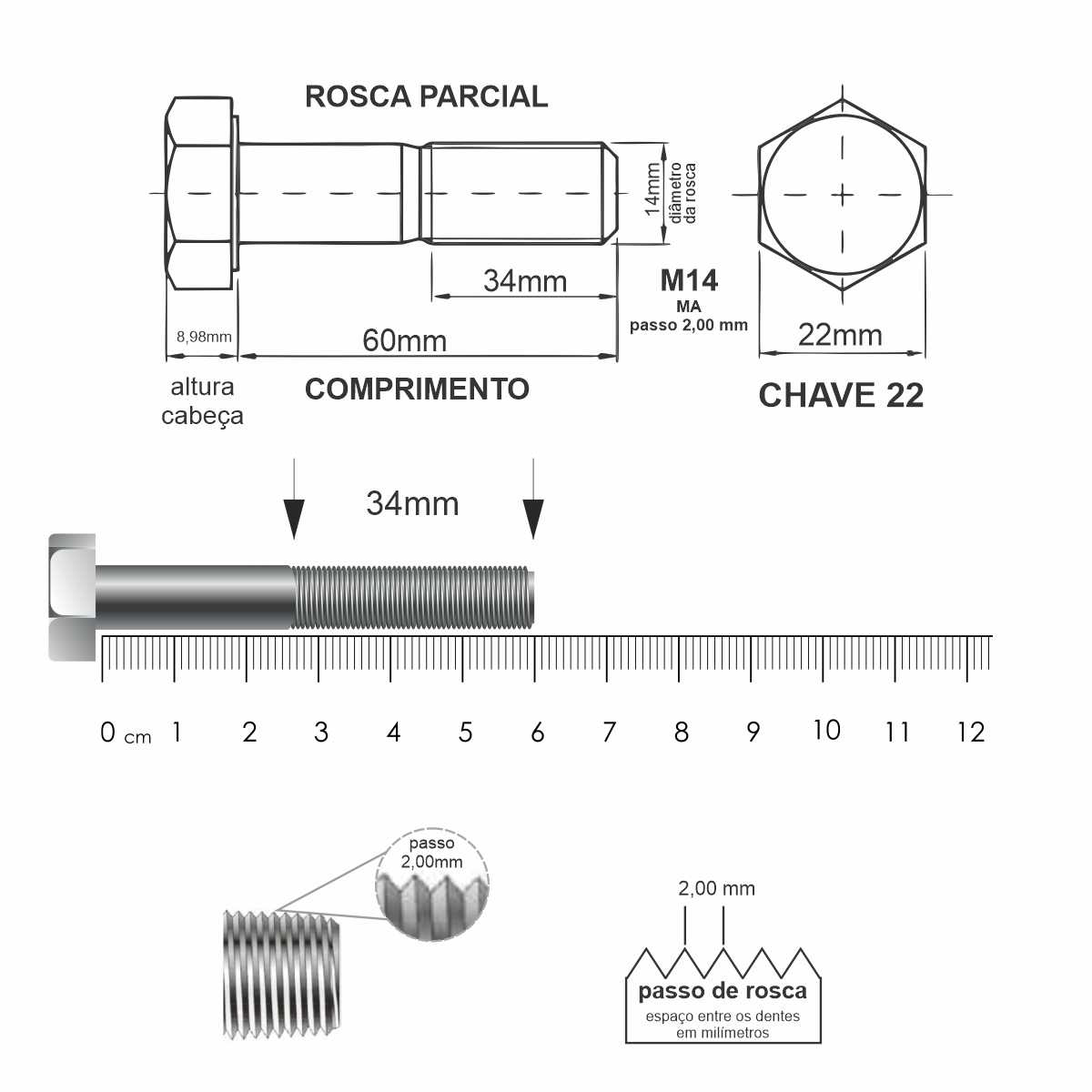 Parafuso Sextavado Aço 8.8 M14 – Tipo de Rosca: MA passo 2,00mm