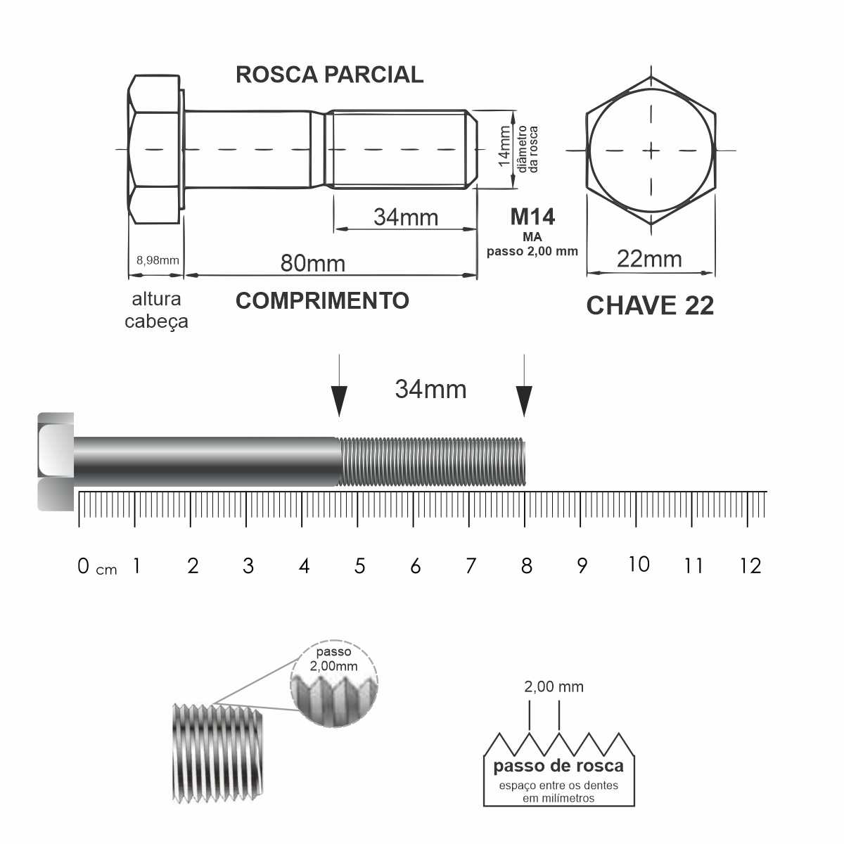 - Rosca: Métrica ISO (padrão DIN 933 / DIN 931)