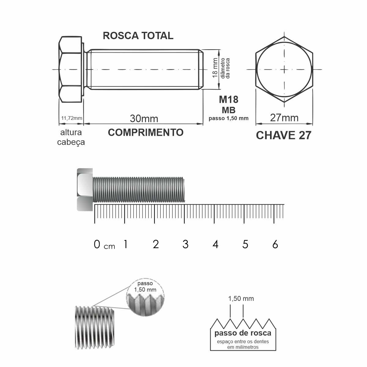 - Rosca: Métrica (rosca ISO) MB passo 1,5mm