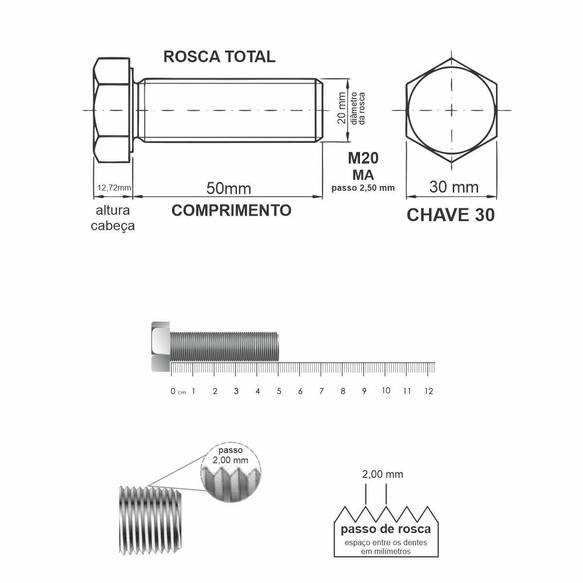 - Largura da cabeça (chave): 30 mm (conforme DIN 933)