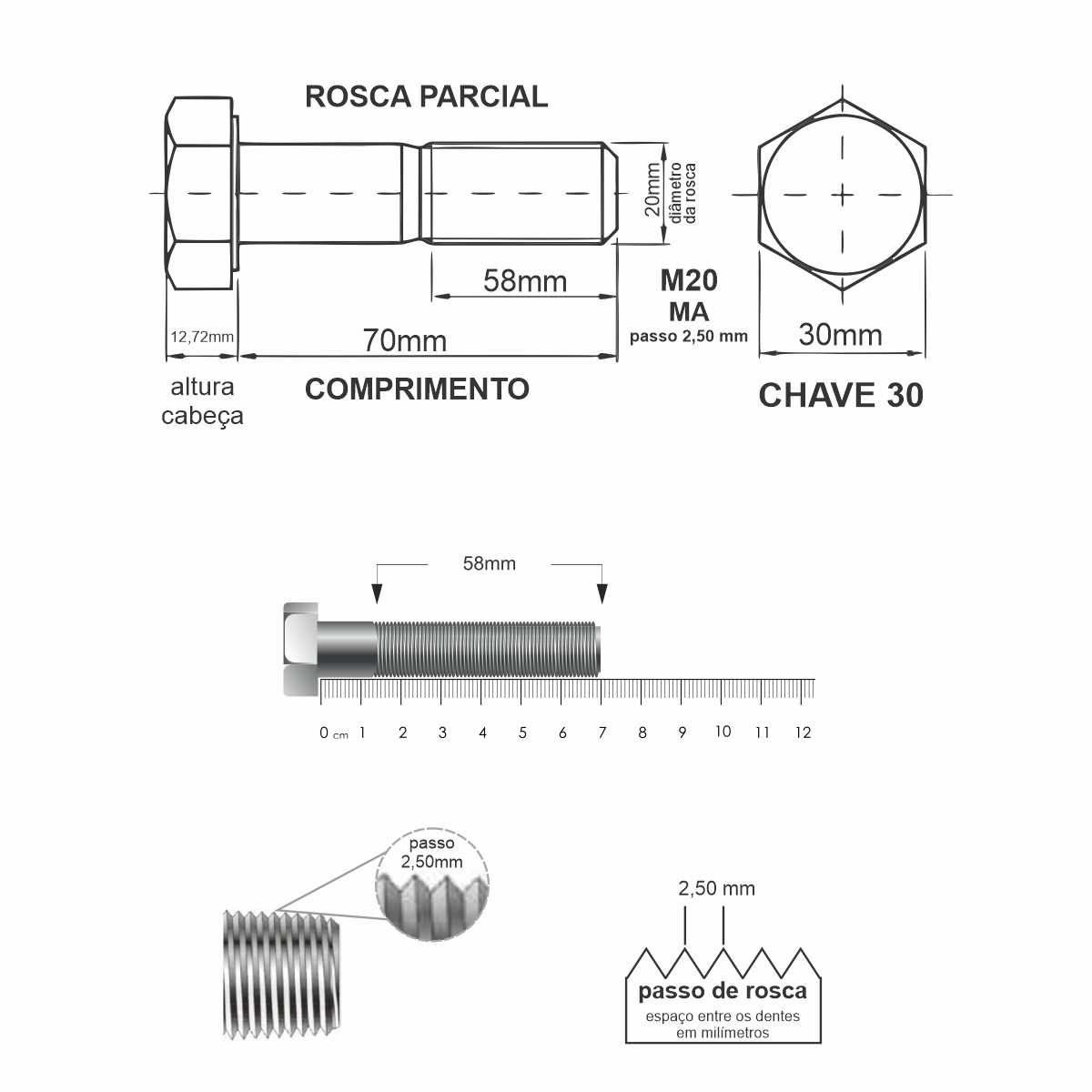 - Largura da cabeça (chave): 30 mm (conforme DIN 933)