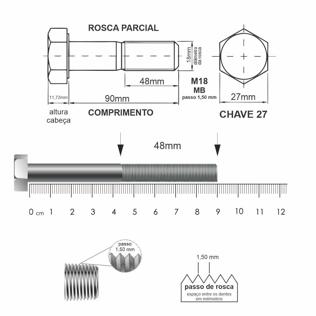 Parafuso sextavado métrico M18 (18 mm de diâmetro), de alta resistência mecânica, fabricado em aço carbono com tratamento térmico, conforme norma DIN 933 / ISO 4017.