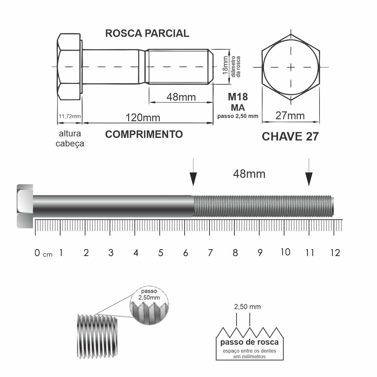 Parafuso sextavado métrico M18 (18 mm de diâmetro), de alta resistência mecânica, fabricado em aço carbono com tratamento térmico, conforme norma DIN 933 / ISO 4017.