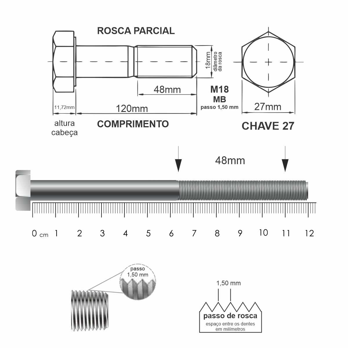 - Rosca: Métrica (rosca ISO) MB passo 1,5mm