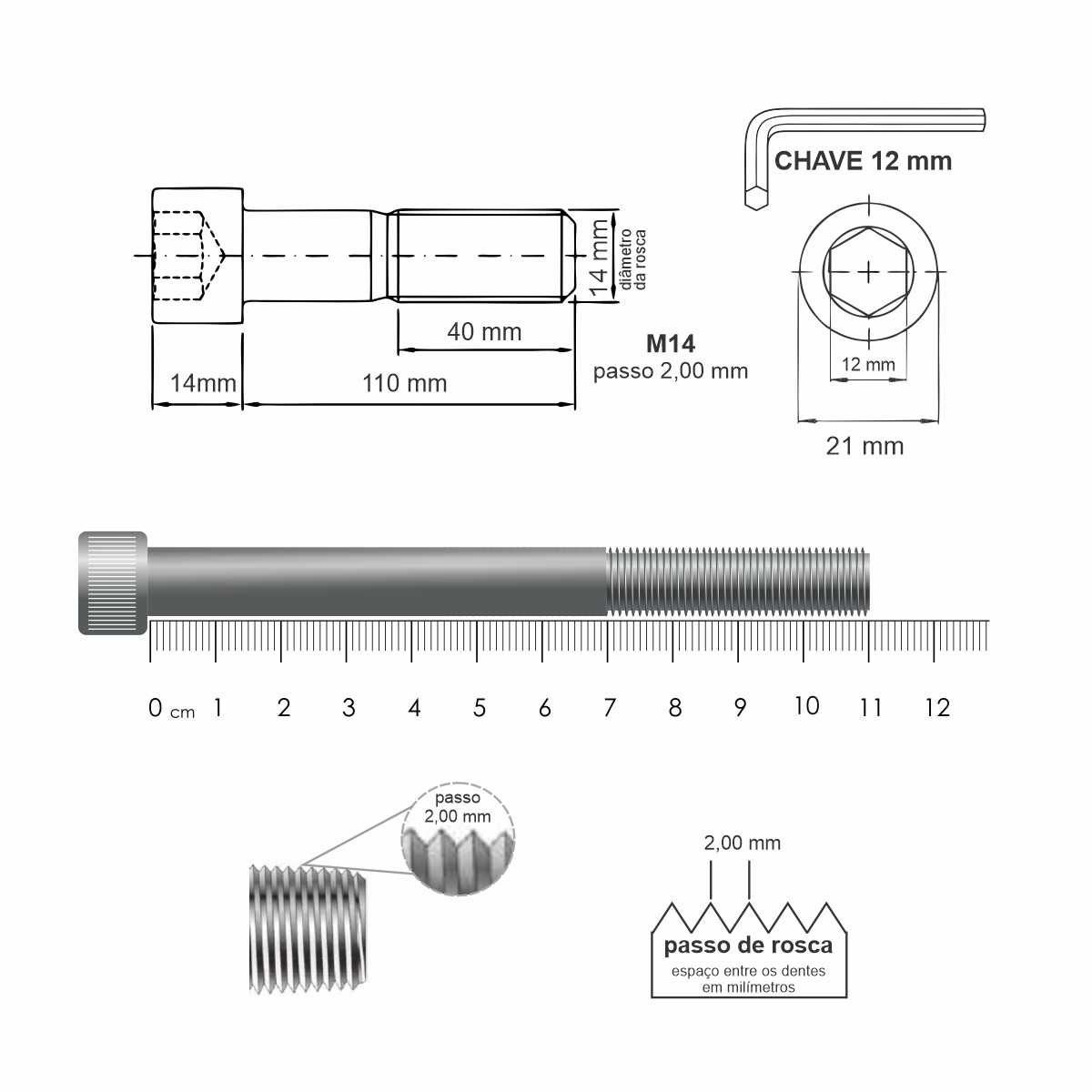- Passo da Rosca: 2,00 mm (Rosca MA – Métrica Grossa)