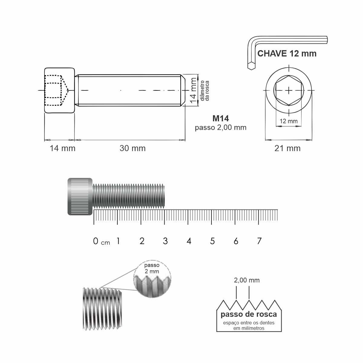 - Passo da Rosca: 2,00 mm (Rosca MA – Métrica Grossa)