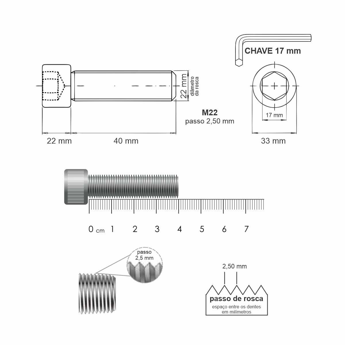 - Passo: 2,50 mm (Rosca MA – Métrica Grossa)