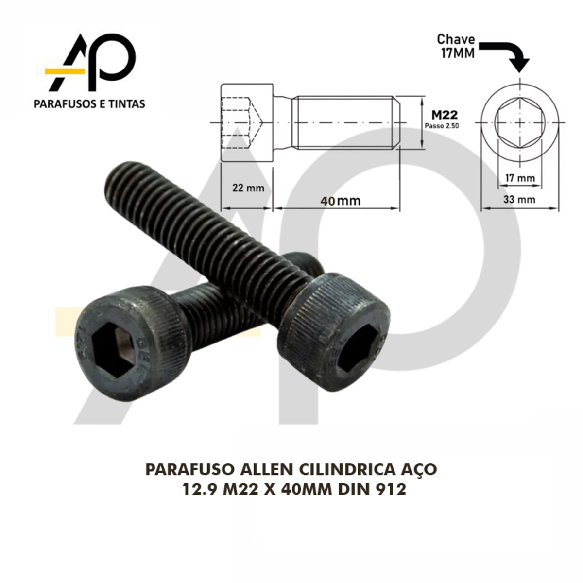 PARAFUSO ALLEN CILINDRICA AÇO 12.9 M22 X40MM DIN 912 - 2 PEÇASCód. 164498
