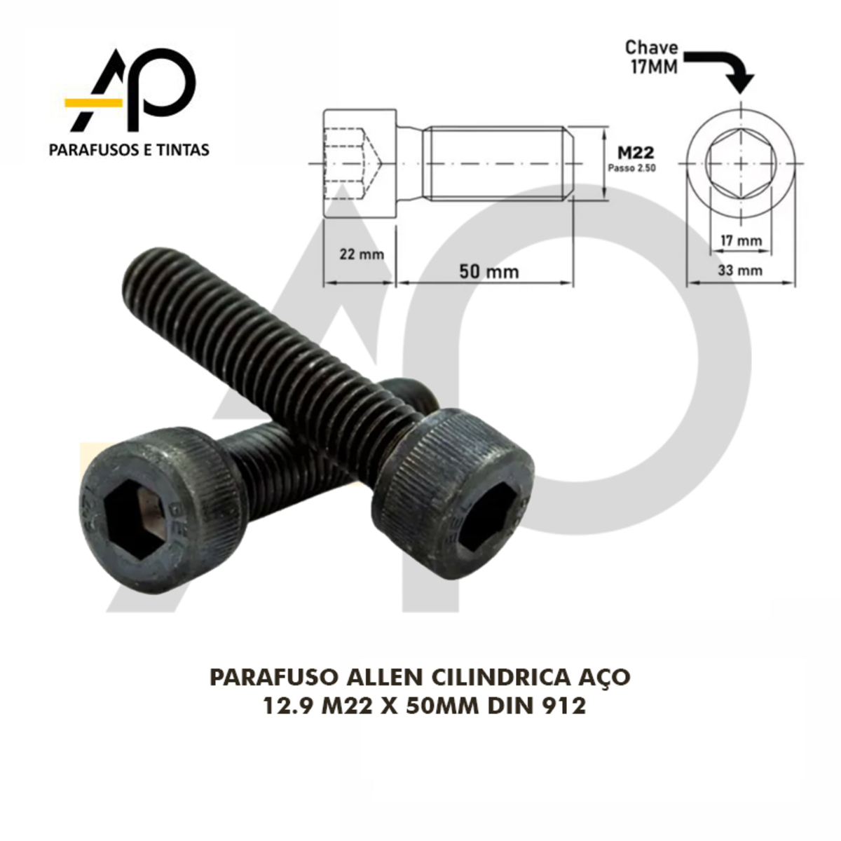 PARAFUSO ALLEN CILINDRICA AÇO 12.9 M22 X50MM DIN 912 - 2 PEÇAS