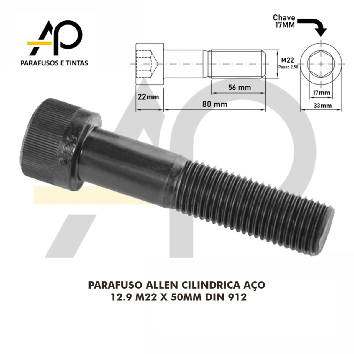 PARAFUSO ALLEN CILINDRICA AÇO 12.9 M22 X80MM DIN 912 - 2 PEÇAS