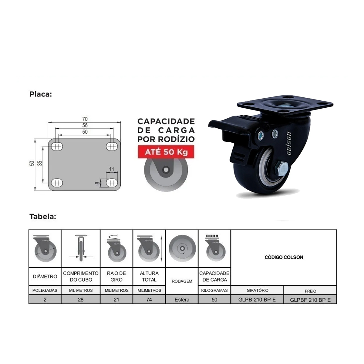 Rodizio Giratorio 50mm Preto 50kg com Freio - Colson