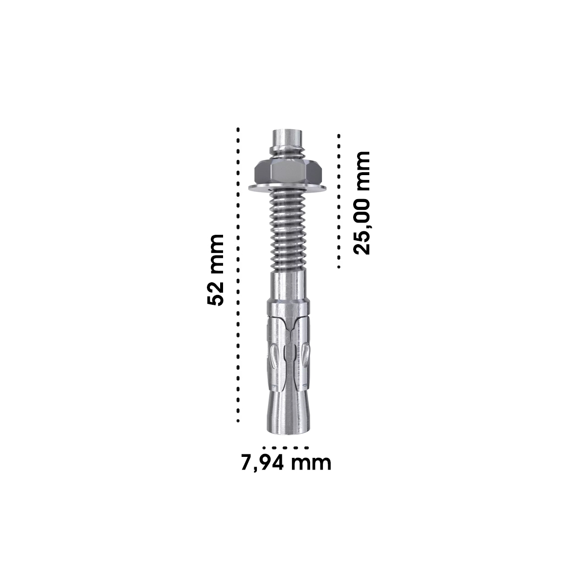 Geralmente, para fixações em concreto, esse tipo de chumbador oferece alta resistência em cisalhamento e tração moderada, sendo adequado para suportar prateleiras, suportes, corrimãos e componentes estruturais leves a moderados.