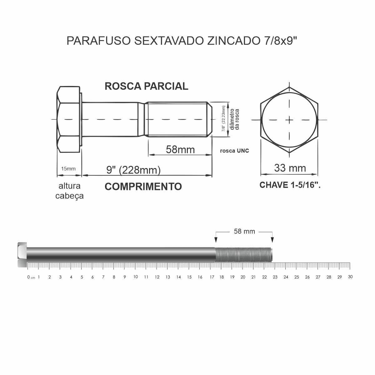 O Parafuso Sextavado Zincado 7/8" x 9" é um elemento de fixação robusto, indicado para montagens que exigem alta resistência mecânica e durabilidade. Possui acabamento zincado, que oferece proteção contra oxidação e corrosão, garantindo maior vida útil mesmo em ambientes expostos à umidade ou intempéries.