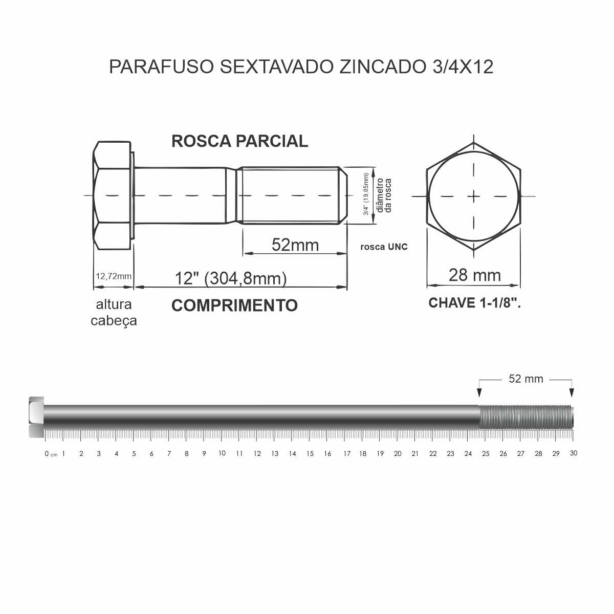 PARAFUSO SEXTAVADO ZINCADO 3/4X12-03 UNID.
