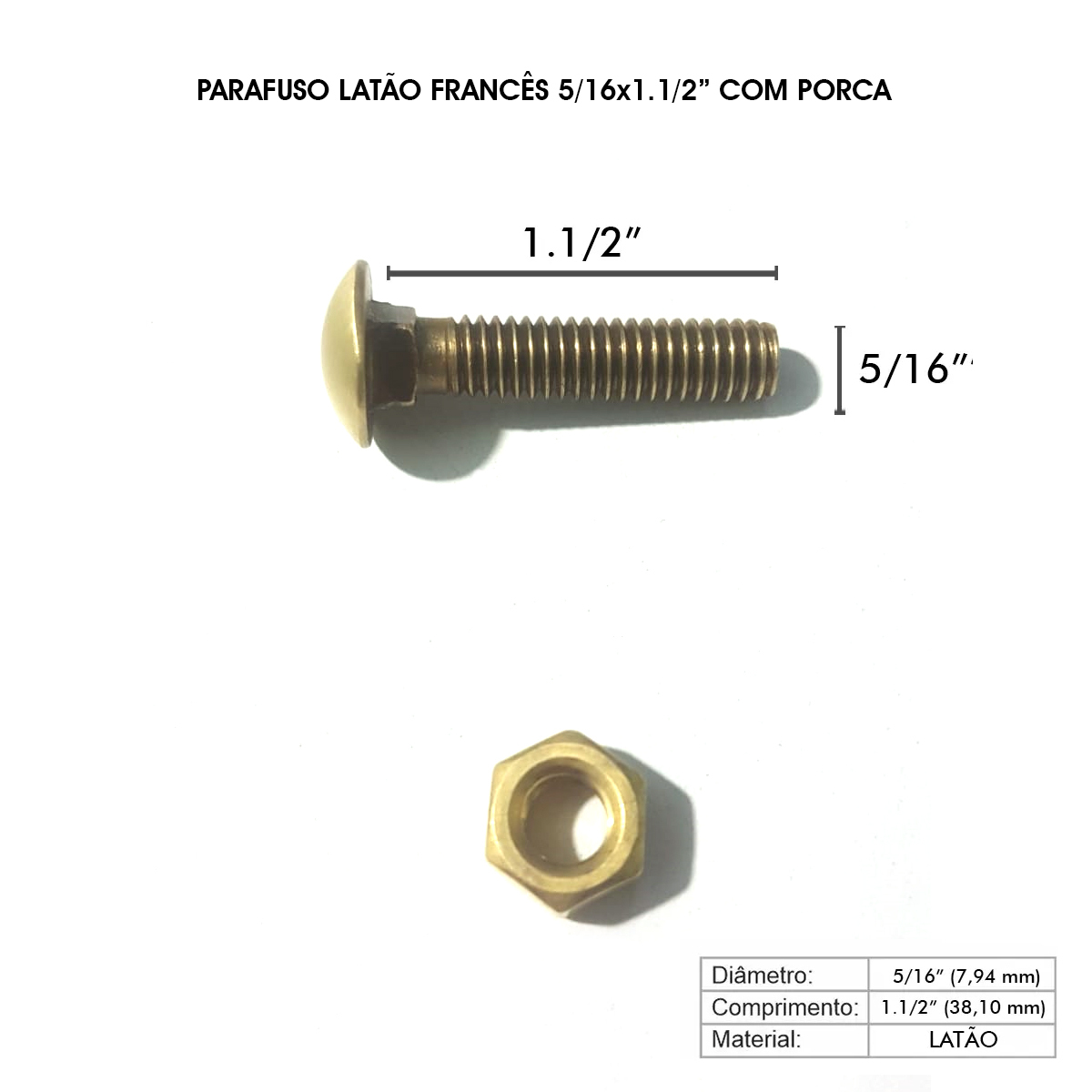 O parafuso francês 5/16"x1.1/2" em latão é utilizado para uniões desmontáveis, garantindo firmeza e estética. O colar sob a cabeça elimina a necessidade de arruela adicional nessa extremidade, enquanto a arruela fornecida é utilizada junto com a porca para distribuir a pressão no ponto de aperto.
