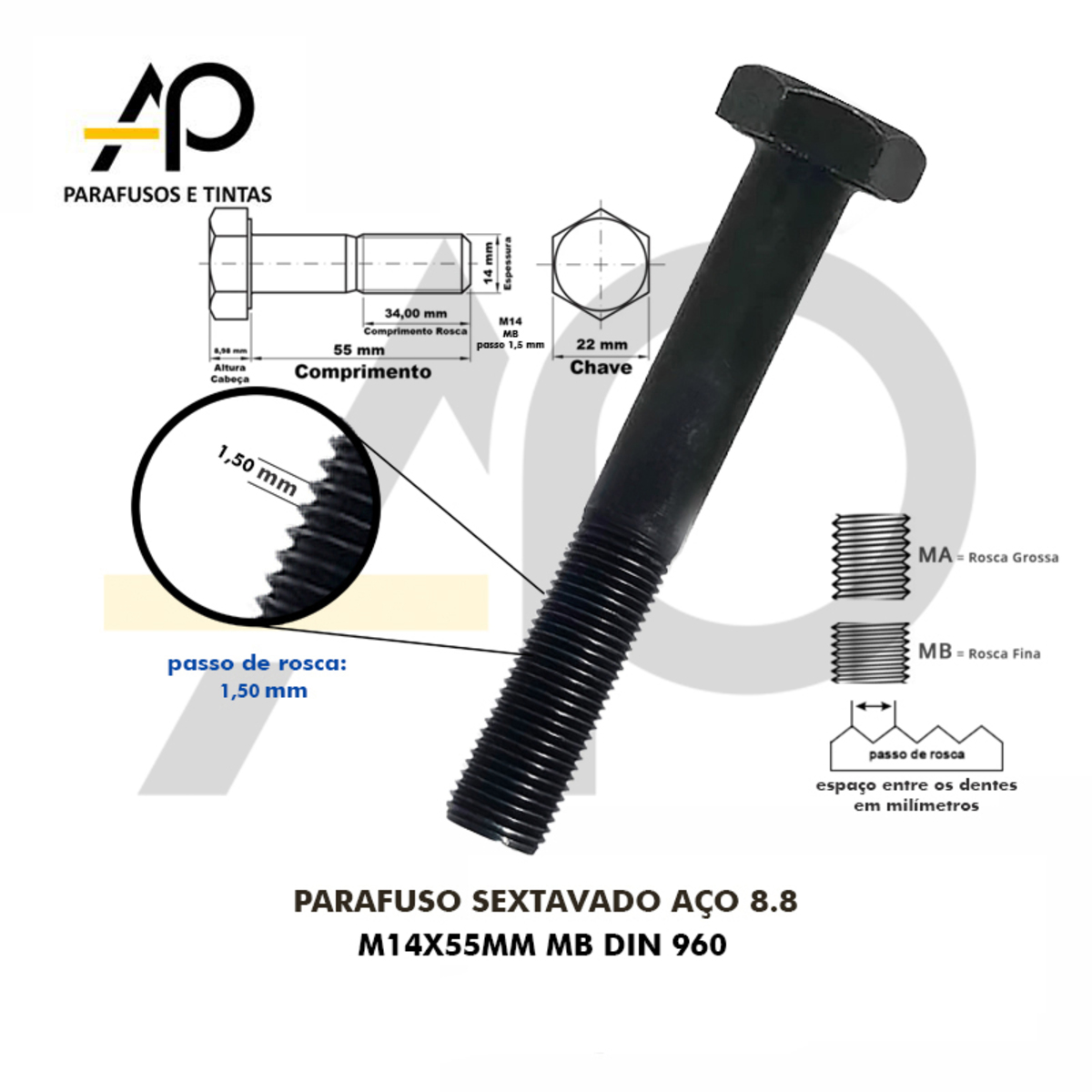 PARAFUSO SEXTAVADO AÇO 8.8 M14X55MM MB DIN 933-25 PEÇAS